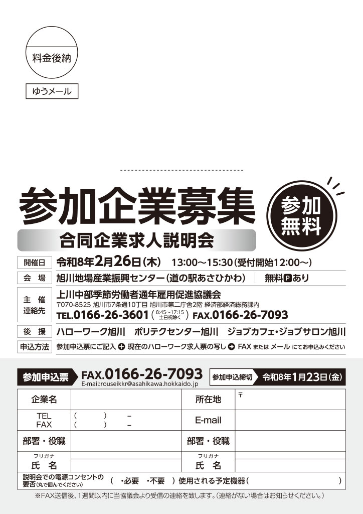 | 開催場所 | 旭川地場産業振興センター(道の駅あさひかわ) | 申込締切 | 令和8年 1月23日(金) |