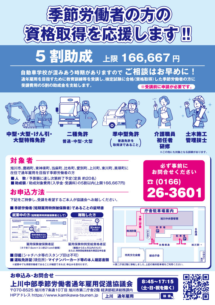 通年雇用を目指すために教育訓練等を受講し、検定試験に合格(資格取得)した季節労働者の方に講習費用の5割の助成金を支給します。